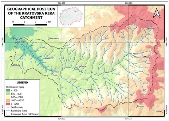 Kratovska Reka flows in the northeastern part of North Macedonia and passes through the city of Kratovo, where it is arranged with a concrete channel (built between 2015 and 2020) (Figure 1). The river source is on Osogovo Mountain at 1366 m (Lisec locality), while the inflow in Kriva Reka is at 412 m, thus, the total fall is 954 m. The length of the river is 17.3 km, and the catchment area covers 68.5 km2.