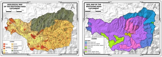 Left: Geological map of the Kratovska Reka catchment (according to [62]). Right: soil map of the area (according to [63]).