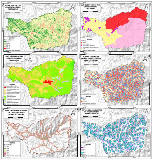 In this research, six causative factors were taken into consideration: lithology, slope, plan curvature, land use, distance from streams, and distance from roads (Table 4; Figure 6). The selection of these parameters was based on the nature of the study area, the scale of analysis, and data availability [50]. For the slope and plan curvature data, a 15 m digital elevation model (DEM) of the entire catchment was used, and SAGA GIS software was employed to derive these variables. The lithology information was obtained from a digitalized and rasterized geological map of the town of Kratovo, at a scale of 100 k. This lithology map was then prepared within the Kratovska Reka catchment using QGIS software. It included nine lithological units, ranging from Precambrian schist to Cenozoic solid volcanic formations, Miocene dacitic ignimbrites, Pliocene andesites, tuffs, and Quaternary clastic sediments. The land use layer was created based on the CORINE Land Cover (CLC2018) classification hierarchy. Distance from streams was determined using the topographic river network (25 k) provided by the State Agency of Cadaster. Distance from roads was obtained from the OpenStreetMap (OSM) road network in vector (.shp) format. In the following steps, five buffer zones were established for both roads and streams, with increments of 20 m. These buffer zones were then converted into raster format. Finally, all the layers, including lithology, slope, plan curvature, land use, distance from streams, and distance from roads, were converted into a raster grid format with cell sizes of 15 × 15 m.