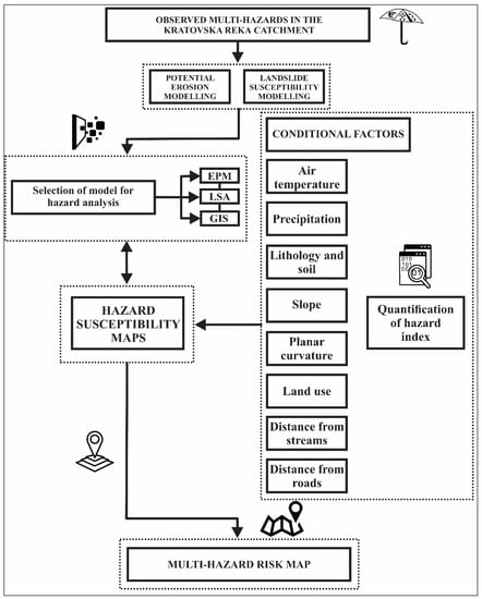 Accordingly, there is a need to develop models for the potential erosion and landslide susceptibility areas in the Kratovska Reka catchment. Therefore, the main objectives of this study are to: (1) perform multi-hazard assessment (hydro-meteorological hazards) in the study area by applying a modified erosion assessment model and joint systematic approaches; (2) produce hazard risk and susceptibility maps, and (3) identify places of greatest erosion risks as the starting point for defining and implementing suitable mitigation measures.