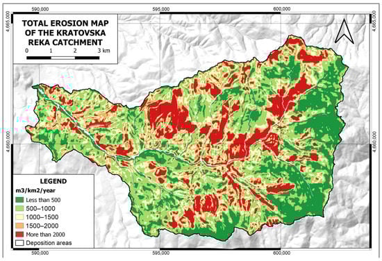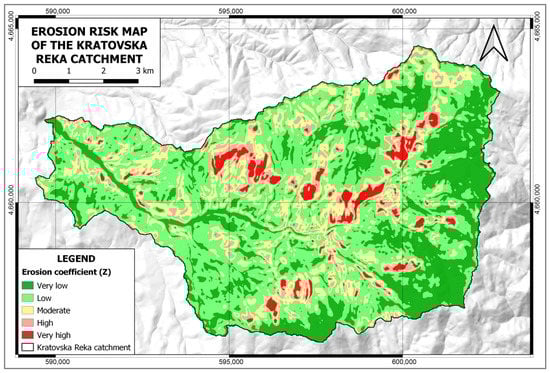 To calculate the total amount of eroded material, with the help of SAGA GIS, through the previously obtained coefficient of erosion Z (or risk of erosion), an appropriate map was prepared for the Kratovska Reka catchment (Figure 8).