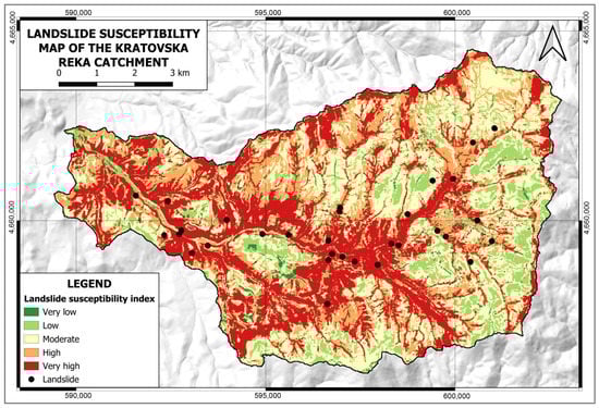 Modelling and mapping landslide-prone areas on a regional scale is a very complex task, because of many natural and anthropogenic factors related to landslide processes. For that reason, the results of landslide susceptibility assessment (LSA) from previous research on similar sized (test) areas were also included [49,91,92]. Furthermore, the work of [93] highlights the importance of evaluating six key triggering factors that significantly impact landslide activity. These factors include lithology, slope angle, land cover, terrain curvature, distance from rivers, and distance from roads.