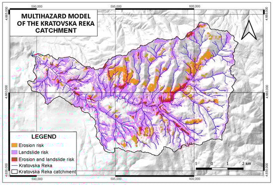 Kratovska Reka is a short (17.3 km) left tributary of Kriva Reka, whose watershed (68.5 km2) is located on the northwestern slopes of the Osogovo Mountains (North Macedonia). Due to the favorable natural conditions and anthropogenic factors, the Kratovska Reka catchment is under a high risk of natural hazards, especially water erosion and landslide occurrences. For this reason, the paper presents an approach of modelling of potential erosion and areas susceptible to the above-mentioned hydro-meteorological hazards in the Kratovska River catchment. Firstly, this study analyzed the main geographical features that contribute to intensive erosion processes in the area. Then, using the Gavrilović EPM erosion potential method, an average value of 0.56 was obtained for the erosion coefficient Z, indicating areas prone to high erosion risk. Furthermore, by using landslide susceptibility analysis (LSA), terrains susceptible to landslides were identified. The results shows that 1/3 of the catchment is very susceptible to mass movements in wet conditions (landslides). According to the combined multi-hazard model, 3.13% of the total area of the Kratovska River catchment is both at high risk of landslides and under severe erosion. The Kratovska River catchment is significantly endangered by the excessive water erosion processes (39.86%), especially on the steep valley sides, i.e., terrains that are completely exposed, under sparse vegetation, and open to the effects of distribution/concentration of the rainfall amounts throughout the year. Identifying locations with the highest erosion risk serves as the initial step in defining and implementing appropriate mitigation measures across local and regional scales, thus enhancing overall resilience to environmental challenges.