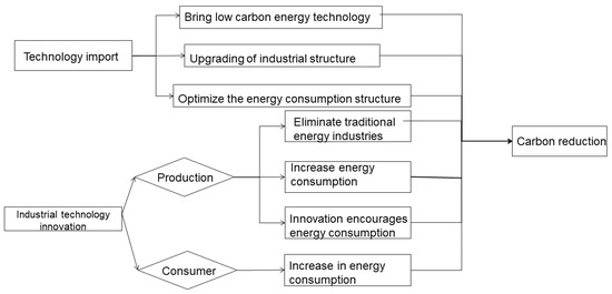 26]. At the same time, due to the law of diminishing marginal benefits of technological imports, the carbon emission reduction that can result from relying only on technology import is limited, and enterprises are likely to switch to high-polluting technologies in pursuit of high returns, resulting in an increase in carbon emissions. The mechanism analysis diagram of technology import and industrial technology innovation is shown in
