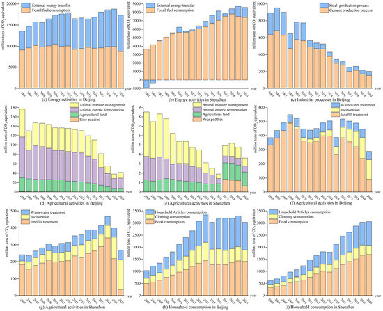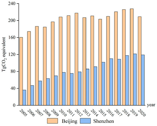 where the subscripts i and j in the equation refer to the fossil fuel types and sectors, respectively, E represents the CO2 emissions (GgCO2), Eij represents fossil fuel consumption (Gg), NCVi represents the net caloric value of fossil fuels (GJ/Gg), EFi represents the carbon content (GgC/GJ), Oij is the carbon oxidation factor (%), and 44/12 is the molecular weight ratio of CO2 to C. These terms are listed in Table 3. The GHG emission coefficients of power and heat consumption are 0.604 (kgCO2/kW·h) and 0.11 (GgCO2/TJ), respectively [38]. The GHG emission parameters of external power transfer in Beijing and Shenzhen are 1.246 (kgCO2/kW·h) and 0.714 (kgCO2/kW·h), respectively, and the GHG emission parameter of heating is 0.11 (GgCO2/TJ) [50].