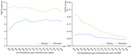 Decoupling between GHG emissions and economic development in Beijing and Shenzhen.