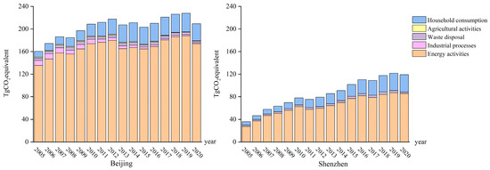 The sources of GHG budget accounting data and emission factors applied in this paper are shown in Table 2. Since the statistical concepts of China’s cities are often divided according to administrative units rather than built-up areas, as well as due to data availability, it is difficult to separately account for activities such as energy consumption and residential consumption, so the emissions involved in agricultural activities within the administrative units of specific cities (Beijing and Shenzhen, in this study) are also included. Because the main industrial products in Shenzhen do not include cement or steel, this study calculated the GHG emissions only from industrial processes in Beijing.