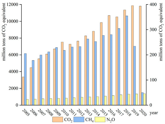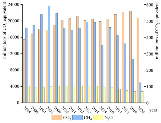 GHG emissions from agricultural activities are accounted for according to the methodology recommended by the provincial Greenhouse Gas Inventory Preparation Guidelines [38]; these emissions mainly include direct and indirect GHG emissions from cropland and CH4 emissions from rice paddies, animal enteric fermentation, and animal manure management. According to the accounting results, CH4 and N2O emissions were converted into CO2 equivalents.