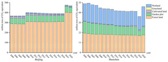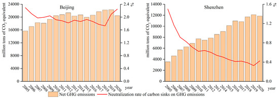 Since the relevant activity-level data of Beijing and Shenzhen are not complete, applying different methods to calculate the urban GHG budgets and selecting different GHG emission coefficients would lead to differences in the GHG accounting results. The carbon sink accounting performed in this paper was based on previous studies, so the accounting standard had a certain universality, but because the actual environment of each city has some differences, the calculated results showed some deviation. Moreover, the data used in this paper were obtained from statistical data. There is no more detailed division of land use and vegetation types, and unused land was not considered in the accounting process. As a result, the calculated values were small. Therefore, we hope that in future research the standards and parameter values used to establish an urban GHG budget inventory can be refined to fully conform to the characteristics of Chinese cities and accurately calculate the GHG budgets at different urban scales. The GHG income and expenditure process contains very complex influencing factors that are not only affected by the population size, economic development, and technical level but are also related to many unquantifiable factors, such as climate change, geographic spatial differences, and living habits. Therefore, in future work, multidisciplinary and cross-disciplinary research should be combined with the actual situations of different cities to propose emission reduction measures.