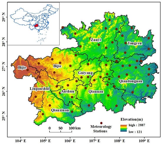 Location, provincial/municipal boundaries, elevation (shading), and spatial distribution of the 61 meteorological stations in Guizhou province.