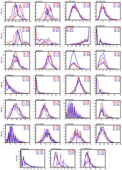 Probability density curves of extreme temperature indices for (a1–a8) warm extremes, (b1–b8) cold extremes, and (c1–c11) precipitation extremes across western Guizhou (WG, including 18 stations of Bijie, Liupanshui, Qianxinan, and Anshun), northern Guizhou (NG, including 11 stations of Zunyi), eastern Guizhou (EG, including 20 stations of Tongren and Qiandongnan), and southern Guizhou (SG, including 12 stations of Guiyang and Qiannan). The mean values of climatic extremes are listed in each density plot, and red, purple, brown, and blue curves represent the WG, NG, EG, and SG, respectively.