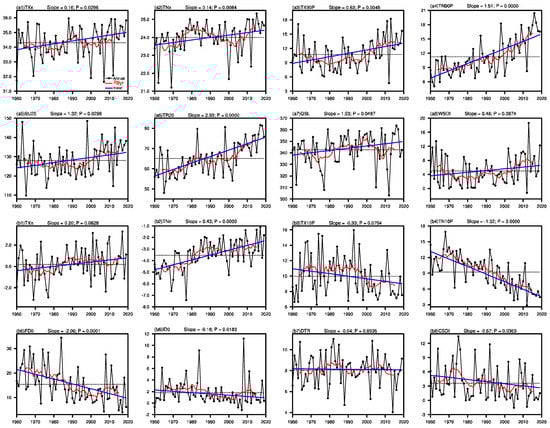 Time series of regional mean of annual average warm (a1–a8) and cold (b1–b8) extremes (black circled line) as well as linear trends (blue solid line) and 9-year moving averages (red dashed line) in Guizhou province from 1960 to 2019: (a1) TXx, (a2) TNx, (a3) TX90P, (a4) TN90P, (a5) SU25, (a6) TR20, (a7) GSL, and (a8) WSDI, (b1) TXn, (b2) TNn, (b3) TX10P, (b4) TN10P, (b5) FD0, (b6) ID0, (b7) DTR, and (b8) CSDI. The corresponding slope, and probability (p) are displayed in the top right corner.