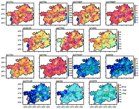 Spatial patterns of Mann–Kendall trends (shadings) for warm (a1–a7) and cold (b1–b7) extremes: (a1) TXx, (a2) TNx, (a3) TX90P, (a4) TN90P, (a5) SU25, (a6) TR20, (a7) GSL, (b1) TXn, (b2) TNn, (b3) TX10P, (b4) TN10P, (b5) FD0, (b6) ID0, and (b7) DTR. The purple (green) dots indicate significant positive (negative) trends (p < 0.05), whereas insignificant trends are shown by gray dots. (a1,a2), (a3,a4), (a5–a7), (b1,b2), (b3,b4), and (b5–b7) share a common color bar.