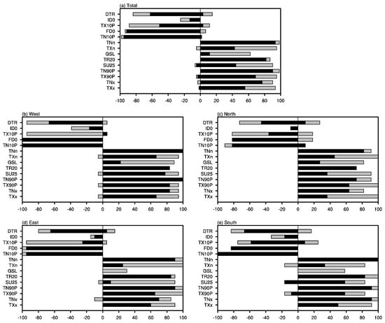Figure 5b–e also display the statistical percentage of meteorological stations with a positive or negative trend in the four subsections of Guizhou. In western Guizhou, TN90P and TNn (TN10P and FD0) significantly increased (decreased) in all the 18 stations, and TNx, TX90P, and TR20 significantly increased in more than 80% of 18 stations. Concurrently, TXx and SU25 (DTR) significantly increased over 60% of the stations in western Guizhou. In the northern Guizhou, only TNn and FD0 showed a significant change in trend in about 80% of the 11 stations, and about 60% of stations had a significant increasing trend in TNx, TX90P, and TR20. In eastern Guizhou, TN90P, TR20, and TNn (TN10P and FD0) significantly increased (decreased) in more than 80% of stations, and TXx, TNx, TX90P, and DTR significantly increased (decreased) in about 60% of stations. Furthermore, in southern Guizhou, TNn and TN10P had a significant variation trend in all the 12 stations, and TNx, TN90P, TR20 (FD0) significantly increased (decreased) in about 60% of the stations. Based on the above results, the long-term trend of these climatic extremes is most significant and robust in western Guizhou.