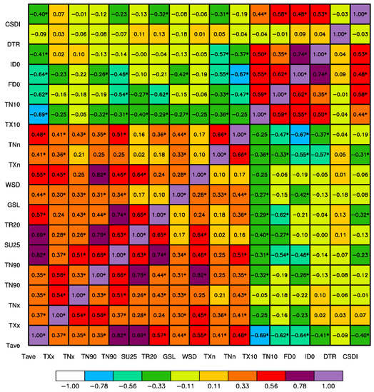 Correlations among annual mean temperature and temperature extremes from 1960 to 2019. * indicates a significant correlation coefficient (p < 0.05).