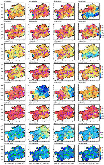 For four cold extremes Figure 7(e1–h4) and Figure 8, TXn shows a positive trend in most of stations in spring and winter, with 67.2% stations having a significant increasing trend in spring. Concurrently, TXn significantly decreased in 21.31% of stations mainly distributed over northwestern Guizhou during summer, and significantly increased in 31.15% of stations, mainly distributed over southwestern Guizhou in autumn. Analogously, the TX10P significantly decreased in 56% of stations during spring, and only several stations display a significant negative trend during summer to winter. TNn shows a positive trend in most stations in Guizhou Province from spring to winter; for instance, stations that significantly increase account for about 92%, 84%, 87%, and 75% of the total stations and spread all over the Guizhou Province during spring to winter, respectively. Analogously, TN10P also significantly decreased within the stations of significant negative trend, accounting for about 85%,70%, 84%, and 84% of the total stations during spring to winter. According to the above results, the long-term variation trend of warm and cold extremes displays obvious differences among the seasons. For instance, TXx, TNx, TX90P, TN90P, TXn, and TNn (TX10P and TN10P) regionally averaged over Guizhou significantly increased (decreased) in spring (Table 2). During summer and autumn, TXx, TNx, TX90P, TN90P, TNn, and TN10P showed significant variational trend, whereas only TN90P, TNn, and TN10P had a significant change trend in winter.