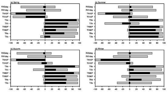 Statistics for proportions of meteorological stations in Guizhou Province that show increasing or decreasing trends of seasonal mean climatic extremes (TXx, TNx, TX90P, TN90P, TXn, TNn, TX10P, TN10P, RX1day, RX5day) during (a) spring, (b) summer, (c) autumn, and (d) winter, respectively, from 1960 to 2019. Black and gray portions of the bar indicate stations at which the trend is significant (p < 0.05) and insignificant, respectively.
