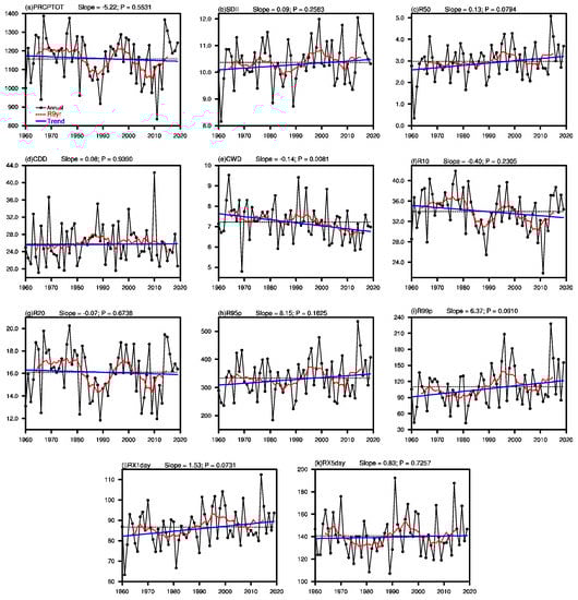 Figure 9 displays the regional annual series of eleven precipitation extremes. As seen from Figure 9, only consecutive wet days (CWD) significantly decreased (p < 0.01) with a rate of −0.14 days/decade. R50mm, R99P, RX1day, SDII, CDD, R95P, and RX5day display an insignificant increasing trend. Concurrently, PRCPTOT, R10mm, and R20mm show an insignificant negative trend. Precipitation extremes also show distinct interdecadal variations. For instance, PRCPTOT, SDII, R10mm, and R20mm enhanced before 1980 and 1995–2001, and decreased in 1980–1994 and 2002–2012. R50mm, R95P, R99P, PX1day, and RX5day weakened before 1990 and 2000–2010, and increased during 1990–2000. In addition, the CDD weakened before 1980 and then weakly increased.