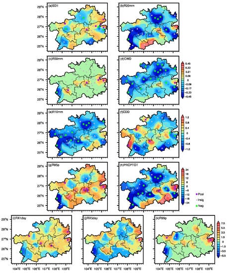 Spatial patterns of Mann–Kendall trends (shadings) for annual mean precipitation extremes based on (a) SDII, (b) R20, (c) R50, (d) CWD, (e) R10, (f) CDD, (g) R95P, (h)PRCRTOT, (i) RX1day, (j) RX5day, and (k) R99P. The purple (green) dots indicate significant positive (negative) trends exceeding the 0.05 confidence level, whereas insignificant trends are shown by gray dots. (a–d), (e,f), (g,h), and (i–k) share a common color bar.