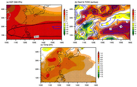 Composite differences between the west and east of the WPSH over years for (a) 500 hPa HGT, (b) downward solar radiation flux (Dswrf, unit: W/m2, color) and total cloud cover (TCDC, unit: %, contour), and (c) 2 m air temperature (unit: °C). Black solid and blue dashed lines in (a) indicate the contour of 5870 gpm (west years) and 5860 gpm (east years), respectively. The dotted regions represent the difference of 500 hPa HGT, downward solar radiation flux, and 2 m air temperature as significant (p < 0.05) in (a), (b), and (c), respectively.