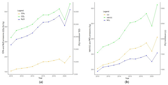 It is a fact that the total annual GHG emissions show an increasing trend during the study period (except 2020), with the most significant contribution from CO2 emissions, as was stated in the third National Communication on Climate Change, which indicates that the transport sector is the category with the highest GHG emissions [58]. The second largest contributions were those of ozone precursors, with emissions between 6.05–7.06%, whose highest values were those of CO. Finally, the minor contributions correspond to the groups of acidifying gases and aerosols, with 0.03% and 0.02%, respectively. So, the urban areas’ dynamic associated with anthropogenic activities causes higher fuel consumption, with increases of up to 100% for gasoline in personal cars and motorcycles and up to 40% for diesel in cargo vehicles and public transport. Therefore, it is possible to affirm that the activities of the transport sector reported highly significant contributions of GHG, ozone precursors, acidifying gases, and aerosols related to the combustion process in the transport sector.