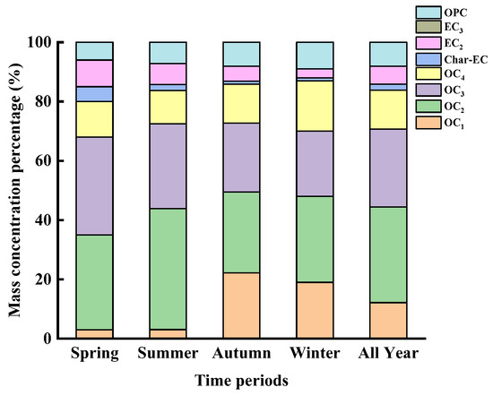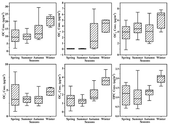 Figure 2 shows the mass concentrations of OC and its fractions (OC1–4, OPC) in PM2.5 of Nanchang in the four seasons.