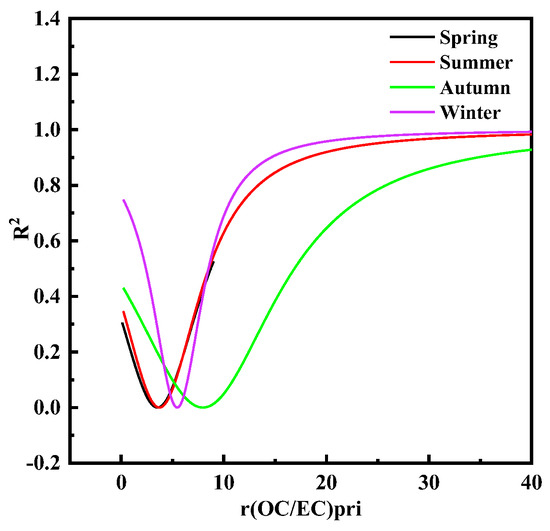 The r(OC/EC)pri values fitted by the MRS method were 3.46, 6.96, 5.45, and 5.90 in spring, summer, autumn, and winter, respectively, when the correlation between SOC and EC was the weakest. The value of r(OC/EC)pri determined by the MRS method represented the ratio of OC/EC in the primary emission source of regional particulate matter. The OC/EC ratio was often used to judge the existence of SOC and to calculate SOC [35]. In this study, the r(OC/EC)pri value exceeded two in four seasons. Therefore, it was thought that the primary emission sources of regional particulate matter included a large part of the contribution of biomass-combustion sources. The OC/EC ratio of biomass-combustion sources is far greater than two, and the OC/EC ratio of primary emission sources of motor-vehicle exhaust and coal combustion is lower than two [36].