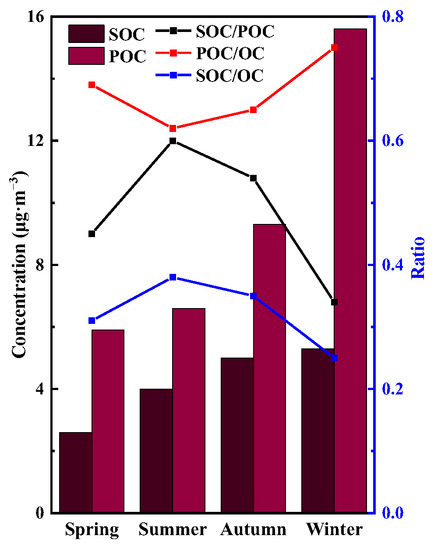 The seasonal distribution of SOC concentration was characterised by a descending order of its concentration in winter (5.3 μg·m−3), autumn (5.0 μg·m−3), summer (4.0 μg·m−3), and spring (2.6 μg·m−3). Higher concentrations of SOC in winter and autumn were mainly due to more primary emission sources in winter and autumn (including particulate POC and gaseous pollutants that will generate SOC under certain conditions). SOC/OC was the highest in summer (38%) and the lowest in winter (25%), reflecting that the higher relative humidity, higher temperature, and stronger solar radiation in summer provided favourable conditions for photochemical reactions, resulting in the easier oxidation of gaseous precursors (such as VOCs) to SOC.