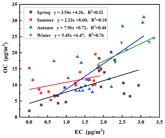 Correlation between OC and EC in four seasons.