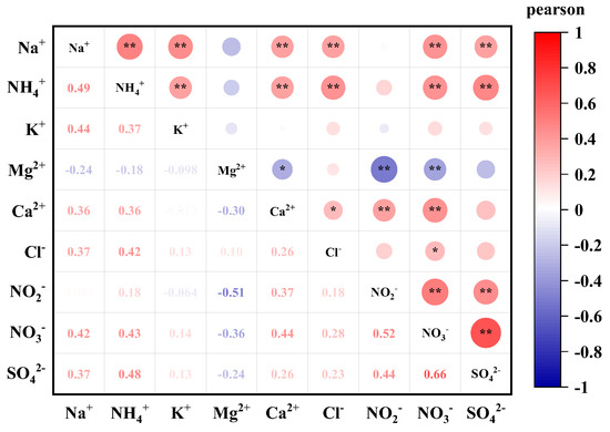 Relationship of water-soluble ions in PM2.5 (* p <= 0.05, ** p <= 0.01).
