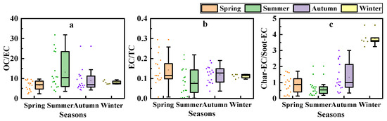 Seasonal distribution of (a) OC/EC, (b) EC/TC, and (c) Char-EC/Soot-EC in this study.