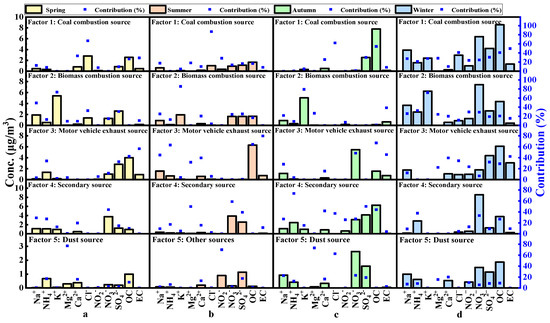 In the PMF figures of spring, autumn, and winter, factor 5 shows a large contribution of Mg2+ as a crustal element, which is consistent with the source-spectrum characteristics of soil dust, so factor 5 in the three seasons was identified as the source of dust. In the PMF figure in summer, there were obvious source-spectrum characteristics of soil dust, which may be related to the wet removal process of particles due to the heavy and frequent rainfall in summer. Factor 5 in summer shows prominent NO2− contribution and relatively average contributions of other components, so it is judged to be other sources mainly from industrial pollution. In summary, the main sources of PM2.5 in the sampling area were coal-fired sources, biomass-combustion sources, motor-vehicle sources, secondary sources, and dust sources.