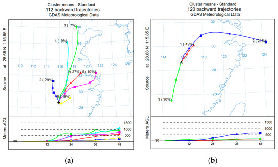 In order to study the sources of PM2.5 in Nanchang, this study analyzed the atmospheric air-mass trajectories by the HYSPLIT backward trajectory model provided by NOAA, and the backward trajectory diagram is shown in Figure 12.