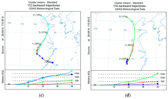 In autumn, a total of 112 backward trajectories were obtained and the number of clusters was determined to be four based on the total spatial TSV. Cluster 1 came from the border between Jiangxi and Anhui, accounting for the largest share of 46%. The trajectory movement time was short and slow and many curves existed during the trajectory, which made it difficult for particulates to diffuse. Cluster 2 came from the East China Sea, was transported to the sampling site from the southeast via Fujian Province, and accounted for a relatively small percentage (10%). Cluster 3 came from the junction of Shandong and Jiangsu near the Yellow Sea area, indicating that the sampling area may be affected by marine sources in autumn. Cluster 4 came from the border between Hebei and Inner Mongolia and was transported to the sampling site via the Shandong and Anhui regions, similar to cluster 3. Both cluster 2 and cluster 4 originated at an altitude of about 1500 m, sinking and settling transport from the southeast and northeast directions, respectively, with faster air-mass movement.