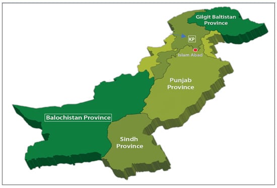 In recent years, the temperature has risen by 0.6–1.0 °C and precipitation has increased by 18–32%, which could dent agricultural productivity in countries such as Pakistan []. Many studies indicate that the situation may deteriorate more in the future, posing a significant issue for farming in Pakistan []. Problems related to CC affect both industrialized and poor countries. However, due to insufficient adaptive capacity, the impact is more serious and obvious in less developed countries [,,]. While relief activities are the most effective way to address CC issues, they need significant financial resources and time. Adapting to changing climatic conditions is an excellent way to mitigate the risky effects of CC in the farming sector in developing countries such as Pakistan [,,]. According to Pakistan’s Sixth Population and Housing Census 2017, the country’s population is expanding at a pace of 2.4 percent each year. This fast population growth is increasing the demand for agricultural products. The agriculture business in Pakistan has a significant impact on the country’s economy, accounting for up to 18.9% of the country’s yearly gross domestic product (GDP) and engaging 42.3 percent of the labor force []. However, agricultural development is crucial to the Pakistani economy and faces many problems. Disasters related to CC, such as floods and droughts, are major difficulties [,].