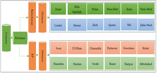 Khyber Pakhtunkhwa (KP) and Balochistan are both in Pakistan that have diverse topography. KP, formerly known as the North-West Frontier Province, is located in the northwestern part of Pakistan. It is known for its mountainous terrain, with the western part of the province being dominated by the Hindu Kush mountain range. On the other hand, Balochistan is located in the southwestern part of Pakistan. It is the largest province in terms of land area but is sparsely populated. Balochistan has a diverse landscape; both provinces offer unique landscapes, rich natural resources, and cultural diversity. They are important for tourism and agriculture and have strategic significance due to their border regions. Twenty-four districts in two provinces of Pakistan (KP and Balochistan) (Figure 1 and Figure 2) were selected as the study area for this survey. Research conducted in Pakistan, a developing country, may have more beneficial policy implications globally. In the selection of input–output variables, the fixed asset investment, planting area, labor force, machinery equipment, and fertilizer consumption of Pakistan’s agricultural sector are used as inputs again, and the total agricultural output value of Pakistan is regarded as the ideal output. When agricultural production activities produce CO2 emissions, it is considered to be a constraint of CC. This study uses agricultural disaster areas as a constraint on food security. Using these molds, the production technology can be clearly defined. It is worth noting that all data are from the National Bureau of Statistics (December 2022 assessment, from the National Bureau of Statistics of Pakistan). In addition, the lack of agricultural CO2 emission data in the autonomous region forced us to choose the remaining 24 districts as the research field, and the study period is 2010–2020. Specifically, input descriptive data/output variables are provided in Table 1.