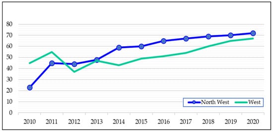 Moreover, it is important to analyze further the regional pattern of the 24 districts. For the sake of brevity, we clustered the 24 districts from the two provinces in the Northwest (KP) and West (Balochistan) regions when analyzing the changing trend of inefficiency. Specifically, we considered the Northwestern and Western regions. The detailed results are presented in Figure 3.