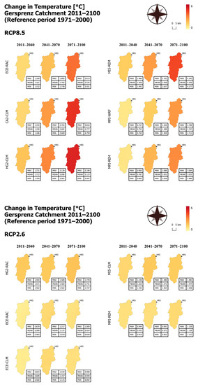In the far future, the projections of the two scenarios are significantly further apart. With a projected increase in mean annual temperature in the far future of between approximately 3 °C and 5 °C, the increase for the Gersprenz catchment is slightly higher than for Germany as a whole, where an average increase of between 3 °C and 4.2 °C is expected for the far future within the high-emission scenario. This finding indicates that warming in the Gersprenz catchment is higher than the German average, underscoring the region’s vulnerability to climate change. In agreement with the German Weather Service, a greater warming of temperatures is expected in southern Germany compared to northern Germany [20,42]. Therefore, the projected results for the variable TAS for the south-lying Gersprenz catchment are considered plausible. The increasing evolution of TAS is significantly weakened in the RCP2.6 scenario. Here, the maximum increase for the far future measures 1.5 °C.