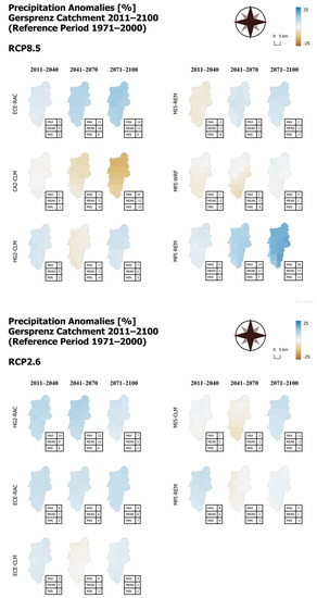 Unlike TAS, PR is much more variable in time and space, and its alterations due to climate change vary [43]. Generally, the annual PR over Germany is distributed fairly homogeneously over the seasons. The average PR in Germany during the reference period of 1971–2000 was approximately 774 mm [18]. In this study, the ensembles project an annual PR of 807 mm in the Gersprenz basin, slightly above the German mean for the same period. This aligns with the expected higher mean annual PR in low mountain ranges. Brienen et al. (2020) found that the relative changes in mean PR between the individual regions in Germany are, with some exceptions, rather marginal. In the low mountain ranges the change signals are mostly smaller on a relative basis [18]. This is confirmed by the findings in this study that identifies no statistically significant developments for PR for the projection period. Examining global studies, it is evident that while the hydrological cycle is likely to change and intensify, there may not be a significant change in average PR. Instead, an increase in the frequency and intensity of extreme events, such as prolonged dry and wet periods, is expected [44,45,46,47]. In general, the core ensemble used in this study reveals larger ranges of change signals for PR compared to TAS projections. The thermopluviogram of change signals within the RCP2.6 scenario exhibit a considerably denser point cloud than that of the RCP8.5 scenario. Within the high-emission scenario, a clear migration of the point cloud is observed due to the rising temperatures.