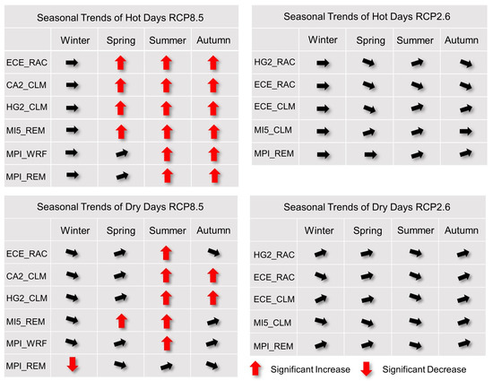 The upper figures show the seasonal trends of hot days [TASmax ≥ 30 °C], the bottom two the seasonal trends of dry days [PR < 1 mm/d], for RCP8.5 (left) and RCP 2.6 (right) from 2011 to 2100. The direction of the arrow indicates whether a trend is positive or negative. Red arrows indicate significant trends.