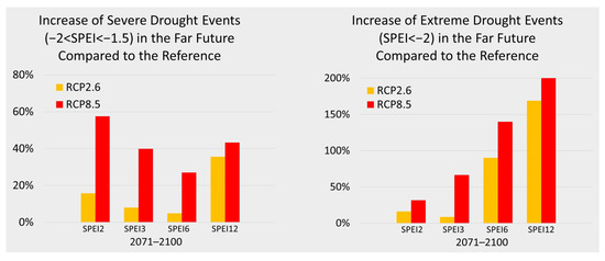 Increase in percentage of severe (left) and extreme drought e4vents (SPEI < −2) in the far future compared to the reference.