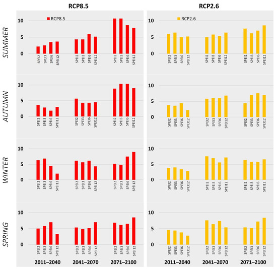 Dry days are projected to increase on average for summer (up to 22% in the far future) and autumn (up to 14% in the far future), while for the winter and spring months, there is a slight reduction in the total number of dry days in the far future of the RCP8.5 scenario (up to a 16% reduction in winter and a 7% reduction in spring). Also in the low-emission scenario, the tendencies of these developments are reflected within the given seasons. However, the changes in dry days are considerably smaller than in the RCP8.5 scenario: e.g., the increase in dry days in the autumn and summer months measure 4% and 2%, respectively. The trends detected for the development of total annual dry days are projected to be significant in the summer months by five out of six ensemble members of the high-emission scenario. On the other hand, the development of the total number of dry days in winter is projected to be negative within the RCP8.5 scenario. One ensemble member projects a significant decrease in dry days in winter.