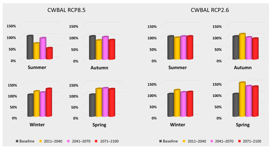 As already noted in prior analysis, no clear trend is discernable in the time series of the annual sums of projected PR or related indices. However, significant seasonal fluctuations in PR are detected. To verify the variation in inter-annual water balance, changes in CWBAL levels for the three time periods compared to the reference period were examined. Figure 9 illustrates the CWBAL of the reference period as 100%, with an increase indicating higher average seasonal CWBAL and a decrease indicating lower seasonal water balance.