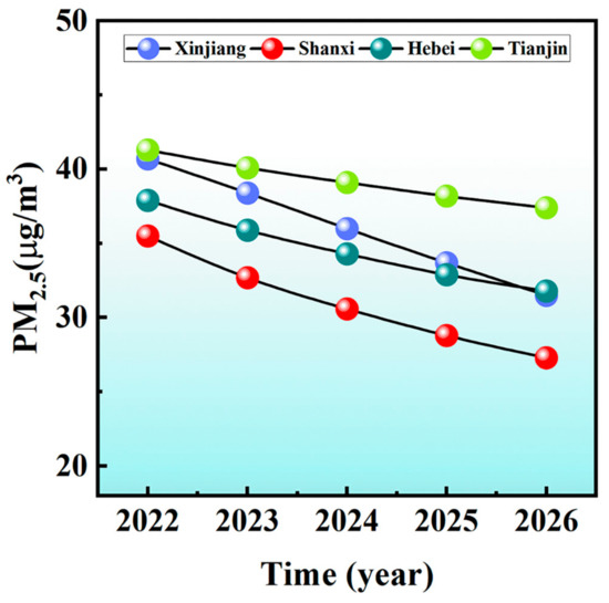 For Tianjin, the annual mean PM2.5 concentration is projected to reach 37.4 µg/m3 in 2026, which will still exceed the threshold concentration for Class II air quality. The projected trends of the annual mean PM2.5 concentration in the four provinces of Xinjiang (not corrected for the effect of sandstorms), Shanxi, Hebei, and Tianjin are shown in Figure 3.