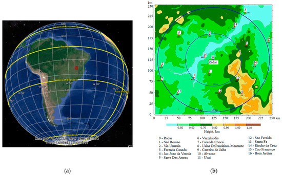 Study area marked by red square (a) on a Google Map [online], South America. Available through: https://earth.google.com/ (accessed on 28 June 2022) and on Topographical map (b) of Januária territory with numbered radar and ground weather stations names.