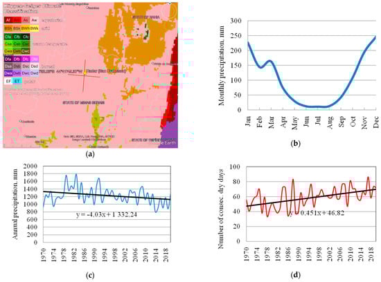 State of Minas Gerais, Brazil: (a)—Climate type bounded by the red crest of the region of concern; (b)—monthly precipitation distribution in the period 1991–2020; trends of annual precipitation (c) and maximum number of consecutive dry days (d) in the period 1970–2020. Data source for (b–d)—World Bank, https://climateknowledgeportal.worldbank.org/country/brazil/climate-data-historical, accessed on 15 June 2022.