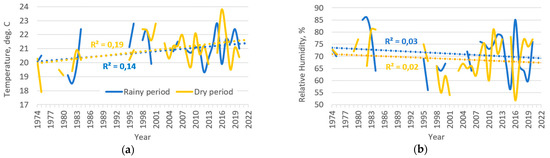 The annual trends for relative humidity, temperature, dew point temperature, absolute humidity, in the surface layer of the atmosphere (from 1000 to 800 mb) for the period 1974–2022, also indicate negative trends, further decreasing favorable conditions for the formation of precipitation-forming clouds. Over the past 49 years, the average air temperature in the surface layer (Figure 4a) has varied from 20 to 22 °C and has increased by about 1 degree both in dry and rainy periods. Relative humidity (Figure 4b) decreased by 3–4% at an average value of 70%. An interesting observation is a slight increase in the absolute humidity of the air in the surface layer (Figure 4c). Its average value varied between 12 and 13 g/kg, and the increase was about 0.2–0.3 g/kg. This moderate increase was facilitated by an increase in the temperature of the layer, at which the surface of the ocean and water bodies releases more vapor due to the evaporation. However, a general characterization of the surface atmosphere in terms of changes in the probability of water drop formation can probably be obtained from the dew point deficit diagram (Figure 4d). It shows that the dew point deficit increased from 5.2 to 6.6 °C over the specified period, which undermines the activation of water droplets on aerosol particles and should lead to a decrease in the water content of the clouds in the study area.