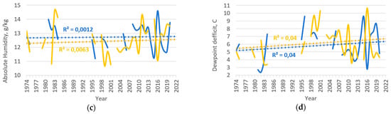Trends of sounding derived parameters over 1973–2022 period in the near surface atmosphere layer 1000–800 mb: (a)—Temperature, deg. C; (b)—Relative humidity, %; (c)—Absolute humidity, g/kg; (d)—Dew point deficit, deg. C. Curve breaks are due to missing radiosounding data.