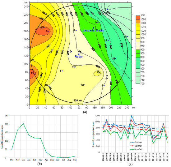 Data from 14 weather stations located in the 120 km vicinity of the Sao Francisco radar (Figure 1b) and having continuous observations from 2000 to 2019 are used to analyze the climatic characteristics of precipitation. Understanding the precipitation trend is essential for long-term planning of RE programs. Trend of increasing precipitation makes use of these technologies irrelevant, while at long-term reduction amplified with low natural rainfall amounts the hypothetically enhanced rain rate may not cover all the costs incurred during the implementation of the technology. For a more detailed assessment of the precipitation characteristics of the study area, we estimated the following periods: hydrological year (October–September); six months of the wet season (October–March) and the four most rainy months (November–February).