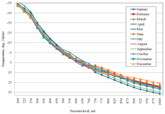 Average monthly temperature stratification of the atmosphere according to ERA-5 reanalysis data for the period 1979–2019.